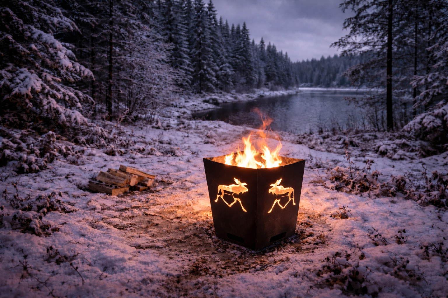 Eldkorg för värme och stämning utomhus – perfekt för trädgård, sjötomt och kalla vinterkvällar. Med det kraftiga gallret i 5 mm stål kan du enkelt steka ägg och bacon i stekjärn, koka kaffe eller värma glögg med stil.